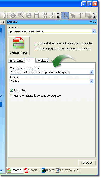 Características de Texto. El tabulador de Texto en la paleta Escanear a PDF en Solid PDF Tools le permite crear un nivel de texto con capacidad de búsqueda (utilizando MODI con Microsoft® Office 2003, Office 2007)y Rotar Automáticamente lo escaneado. Texto con capacidad de búsqueda le permite encontrar rápidamente la información deseada en un documento.