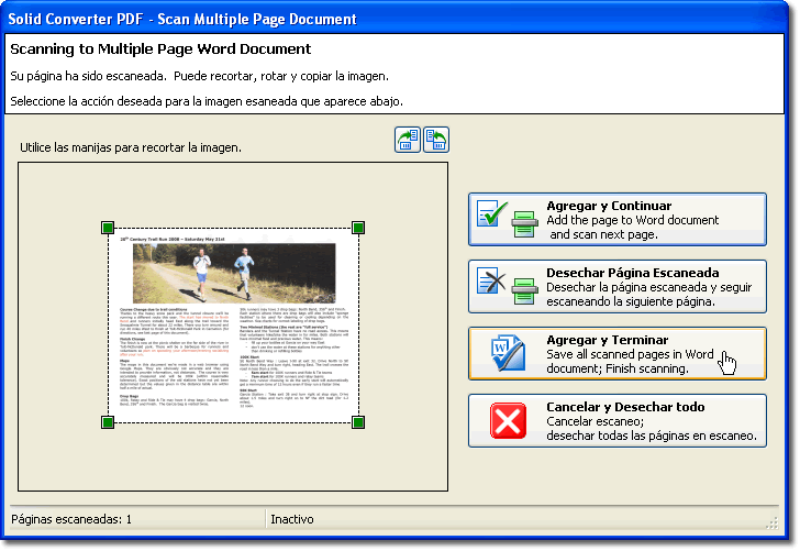 Escaneando Su Documento. Haciendo click en el botón "Escanear a Word" inicia el proceso. Existen varias características en Solid Converter: soporte para alimentador automático de documentos, recorte manual o automático, rotación automática o manual, etc. Siga las instrucciones que aparecen en la pantalla.