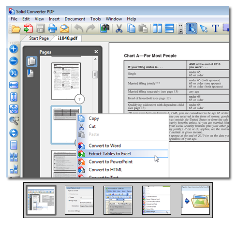 With our WYSIWYG (What You See Is What You Get) user interface in Solid PDF Tools you can extract tables from a selected set of pages within your PDF document quickly and easily. Using Shift+Click or Ctrl+Click, select the desired pages in your PDF. Right-click and select "Extract Tables to Excel".
