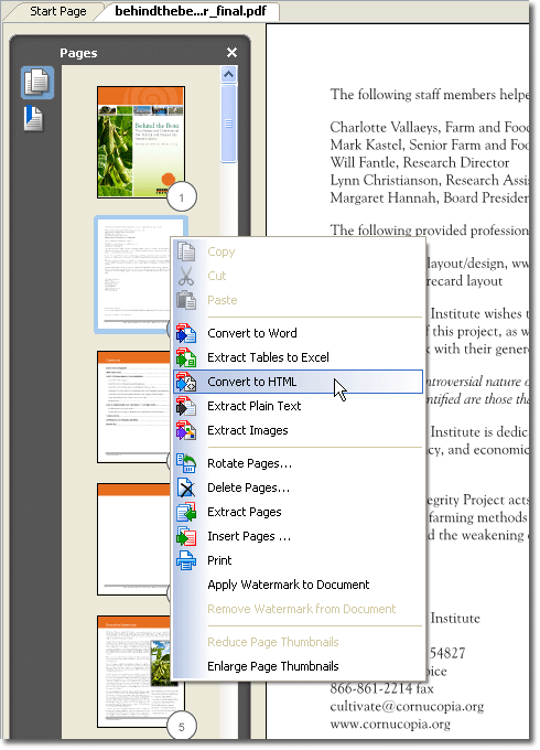 轻松转换. 在 Solid PDF Tools 中右击功能使您能快速将单页或多页内容转换为 HTML。使用 Ctrl+Click 或 Shift+Click 来使用“页窗格”选择要转换为某页或某些页。然后右击选择“转换为 HTML”…